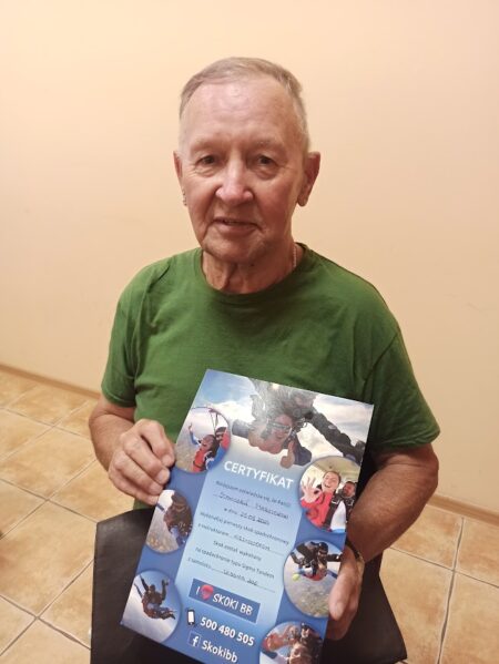 Nietypowy prezent sprawił sobie 77-letni mieszkaniec Zebrzydowic. Stanisław Marczewski, na okoliczność swego jubileuszu, postanowił wykonać skok ze spadochronem. Taki właśnie kilka lat temu powziął pomysł na zrobienie w życiu czegoś, z czym wcześniej nie miał do czynienia. I udało się! – Zrobiłem to pierwszy raz, nie byłem nigdy wcześniej spadochroniarzem, nie miałem z tym nic wspólnego. To był taki mój nagły pomysł i poryw seniora. Na kursie instruktażowym byłem najstarszą osobą – opowiada nam pan Stanisław.